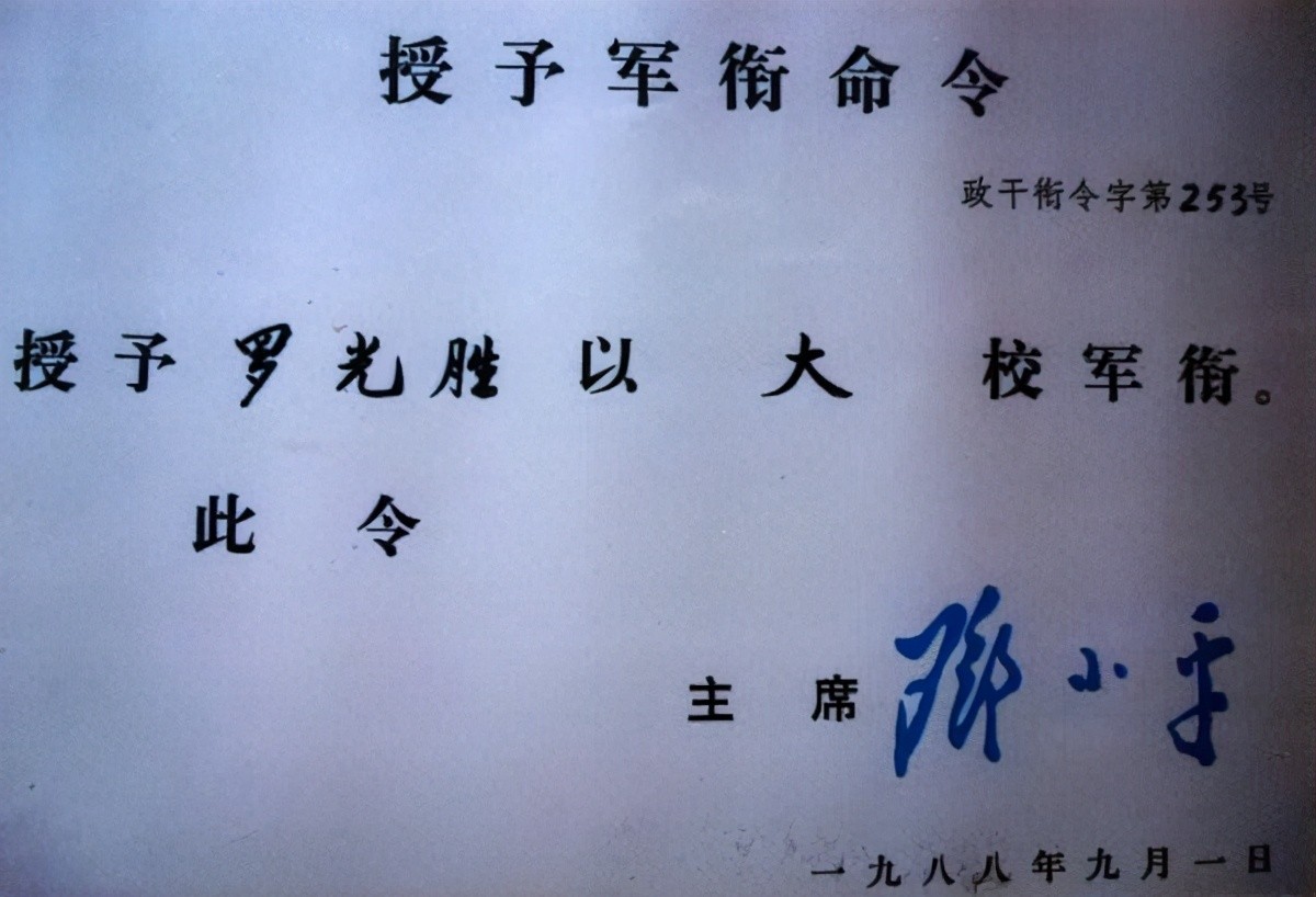 1988年9月1日,中央军委主席邓小平签发的授予罗光胜大校军衔命令。