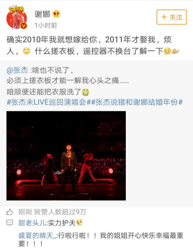 就像张杰在山东开演唱会,和谢娜合唱了一首《蓝精灵》后,张杰在舞台上再次对谢娜甜蜜告白,却翻车记错的结婚的时间,把2011年记成了2010年,于是有了引起了大批谢娜粉丝的不满,甚至有出言中伤的,但是张杰早已经不是钢铁直男,发微博自罚要跪搓衣板和遥控器,机智回应。