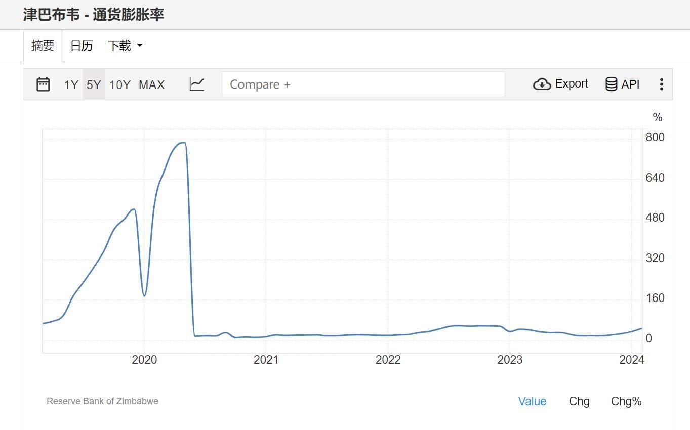 新津元对美元的官方汇率为2.5:1,当时黑市上的汇率就是4:1,三个月后,美元的汇率已经接近13:1.然后,津巴布韦的通胀又回来了。2025年津巴布韦的通胀率是10.62%,此前8年的通胀率则一直维持在个位数。2025年废除外币之后,通货膨胀率又一度反弹到了255.3%,2025年则达到了800%。