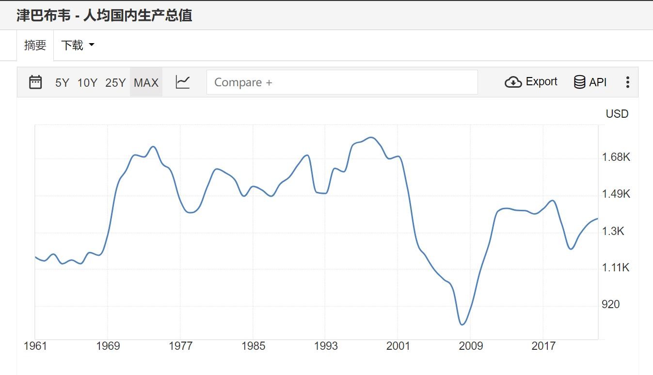 1980年津巴布韦建国的时候并不是一个穷国,人均GDP1540美元,当时中国是430美元,韩国1715美元,土耳其1561,在全世界150个国家中能排到70名上下,相等于中等收入国家。