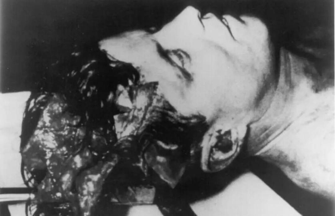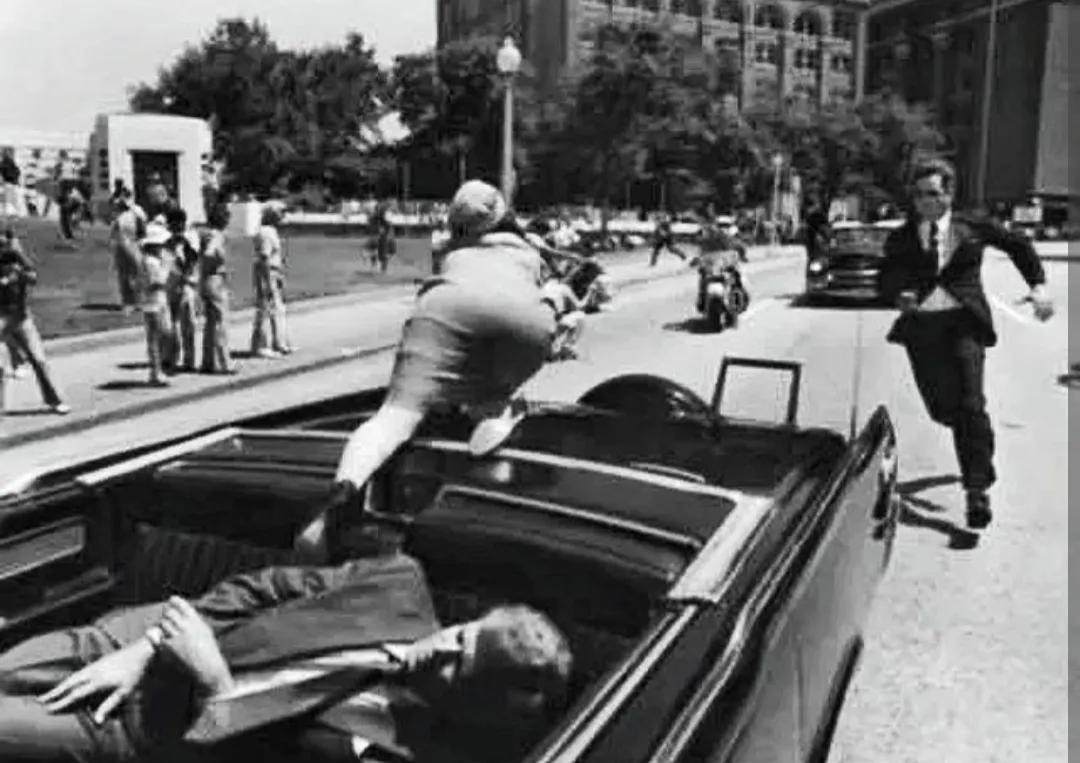 此时的肯尼迪,一脸迷茫和疑惑,事情发生得太快,还来不及反应。他试图举起颤抖的右手抓住后脑勺,但很快就无力地落下了。瞬间,鲜血伴随着白色的脑浆喷洒而出,溅到杰奎琳的脸上、身上以及康纳利夫妇和前面开车的特工和保镖身上。
