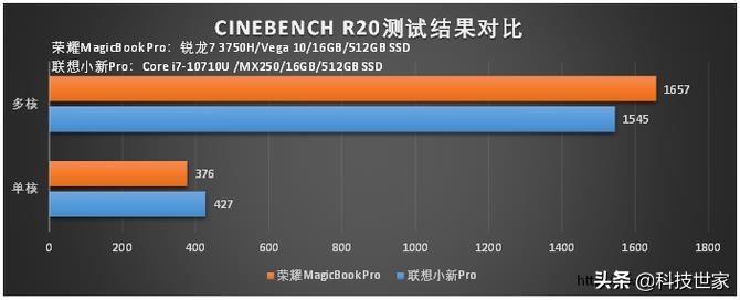 使用CINEBENCH R15和CINEBENCH R20进行检测,可以看到,R15测试中,锐龙7 3750H的多核成绩领先了约15%,R20的多核成绩领先了约7.2%。