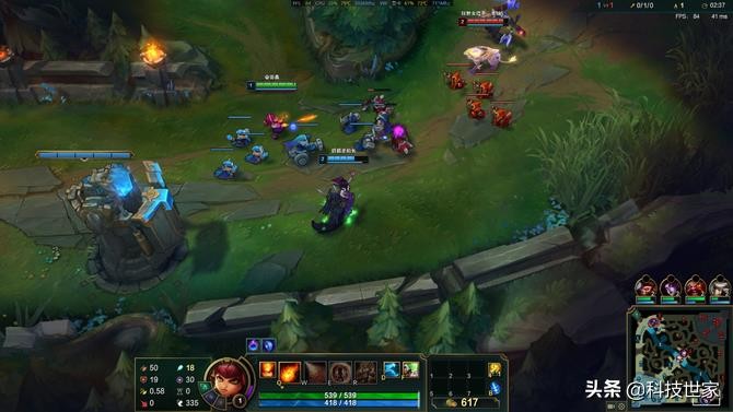 3.《英雄联盟》1080P分辨率,品质优先,人物、环境、特效、阴影中等。图像质量中。CPU功耗9W,占用26%,温度79°;显卡占用61%,温度83°,频率711MHz。FPS 84。