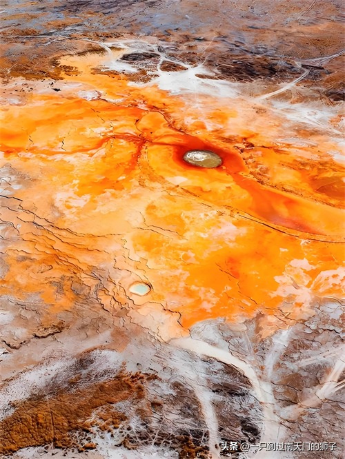 从空中俯瞰,泉眼与喷涌而出的泉水以及周围土地上深红色环带状的沉淀物,组成了一个奇特的瞳孔造型,仿佛一只镶嵌在大地上的眼睛。这里的泉水由于蒸发强烈,流经地表的泉水干涸沉淀后,硫磺和其他矿物质形成了如血管一般的奇特纹路,色彩斑斓,有红褐色、金黄色、铁锈色等,让人惊叹大自然的鬼斧神工,具有油画般的质感。