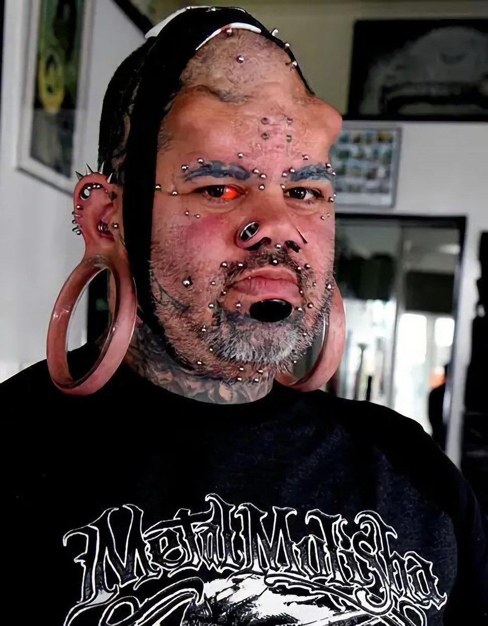 卡拉·凯威(Kala Kaiwi),美国夏威夷人。他是世界上耳洞最大的人。他的耳洞被套进了两个直径达10.9厘米的圆环,一个成年男子的拳头甚至可以穿过他的耳洞,令人惊讶不已。凯威原在美国拉斯维加斯接受人体艺术训练。1999年回到自己的家乡夏威夷,开始热衷于纹身和改造身体。凯威酷爱在自己身上“穿洞”,他的脸上密密麻麻地穿了上百个钉子,鼻子上还有一个直径超过1厘米的大洞。他还将硅胶植入到额头,看起来就像两个犄角。凯威甚至曾经用牙线分裂了自己的舌头。凯威几乎对自己身体的每个部位都做了改造,真是让人难以理解,畸形美之恋。小编欣赏不了这样的美,不忍细看。
