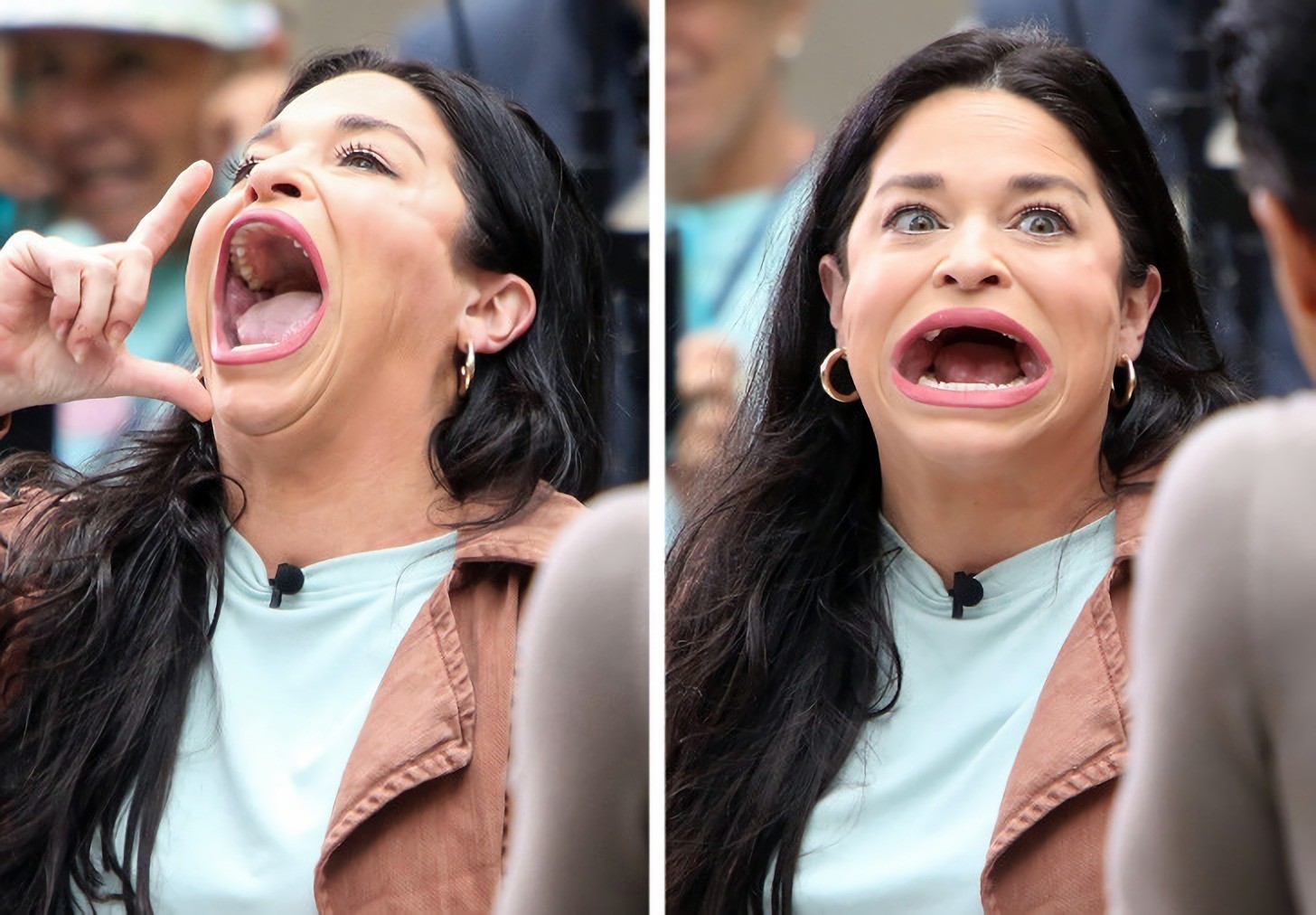 她的舌头不仅可以触碰到鼻子、下巴,如果借助一点外力的话,甚至还可以舔到眼睛,真是逆天的存在。