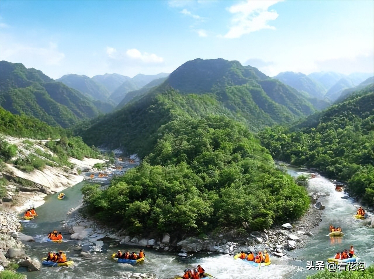 19.西峡县的名胜古迹-老鹳河景区。老鹳河是丹江的源头,也是南水北调中线工程上游重要水源涵区。主要干流长254千米,流域面积4219平方公里,落差1340米,漂流段落差480米,漂流距离12公里,是中原地带最早开发漂流,漂流距离最长,最刺激、规模最大的项目,被人们称为“中原第一漂”。漂流过程中沿途佳境颇多,有“鹳河第一滩”“九龙滩”、形象逼真的“卧龙”、“龙椅”、惊心动魄的“跳舞滩”等大小十八滩,在感受浪涛飞舟的同时,戏水也是鹳河漂流的一大乐趣。这里天天都泼水节,处处是水仗区,无论认识与否,见面礼就是互相泼水。漂流过程中,有一批训练有素的护漂员为你保驾护航、提供全套漂具及导游、保险等系列服务,让你有惊无险,让你漂的惊心,游的舒心,玩的开心,让你感受道大自然的洗礼,体味回归自然、挑战自然的乐趣。