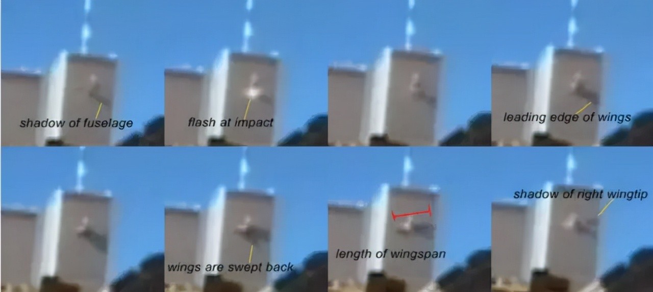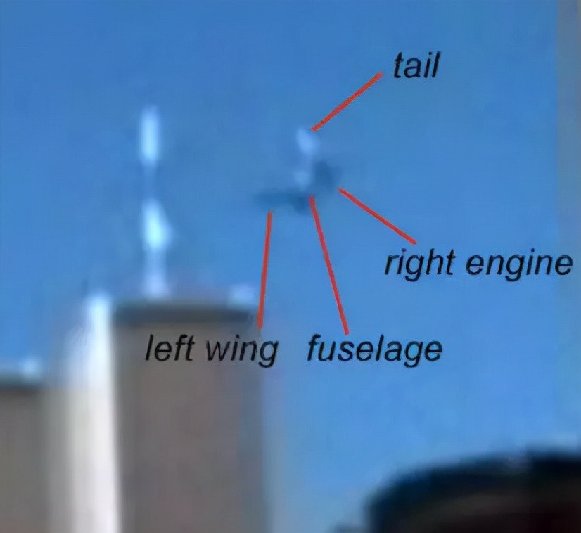 但是离奇的是, 那架被美国主流媒体报道为波音767-200型的飞机, 在撞入世界贸易中心摩天双塔北楼前的刹那间,有照片和录像清楚地显示了那架飞机悠长的机鼻在“亲吻”(接触)摩天大楼前的瞬间,大楼已经爆发出一团耀眼的光亮火球。