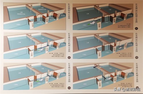 当船只由下水位向高水位行走时,船只由崇长港进入下闸室,关闭下闸门,开启中闸门和下澳斗门,下澳水补充下闸室,船由下闸室进入上闸室,关闭中闸门,开启上澳的斗门,以上澳的储存水补充上闸室,并由下澳车水入上澳,直至上闸室的水位与上塘河水位持平,开启上闸门,船只由上闸室进入上塘河。