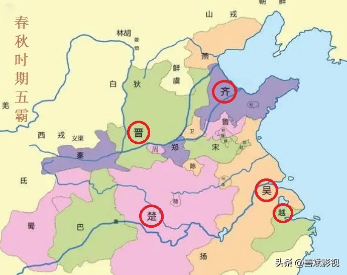 在中国古东周末期史上大分裂的春秋时期(前770年—前221年),东周周平王的皇室势力减弱,下属各封诸侯群雄纷争割据,一度分裂成109个国家,后经各诸侯国争战吞并,一度形成了齐国齐桓公、晋国晋文公、楚国楚庄王、吴国吴王阖闾和越国越王勾践五霸争雄局面。