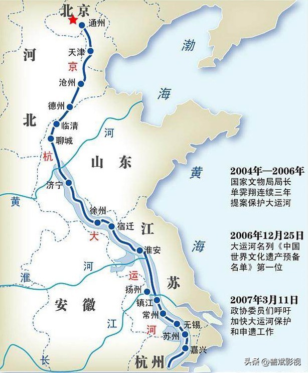 京杭大运河这条中国古代遗留下的水利工程,于 2014年,在第38届世界遗产大会上获准列入世界遗产名录。经联合国组织实地考察,最终大运河遗产分布申遗范围被列入的有2个直辖市、6个省、25个地级市。