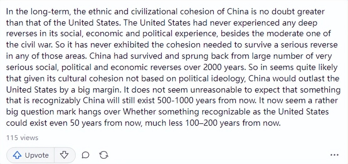 而从长远来看,中国的民族和文明凝聚力无疑大于美国,美国从未经历过任何深刻的社会、经济和政治倒退,除了内战中的温和倒退。