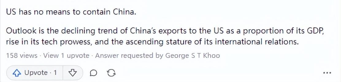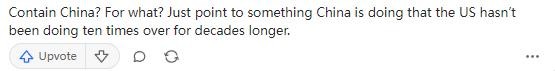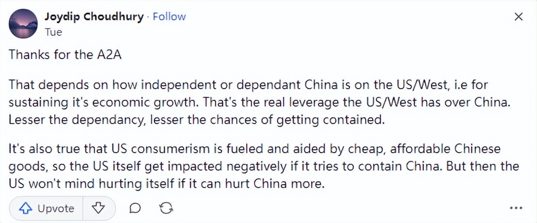 另一位来自瑞士的网友评论道,这取决于中国在多大程度上依赖美国/西方,即维持其经济增长,美国是否有对中国真正的影响力,依赖性越小,被遏制的机会就越小。