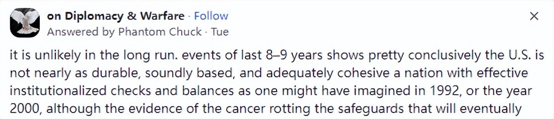 随后来自加拿大的网友评论道,从长远来看,这不太可能,过去8-9年的事件非常明确地表明,美国早已不再是一个持久、稳健、凝聚力强的国家。