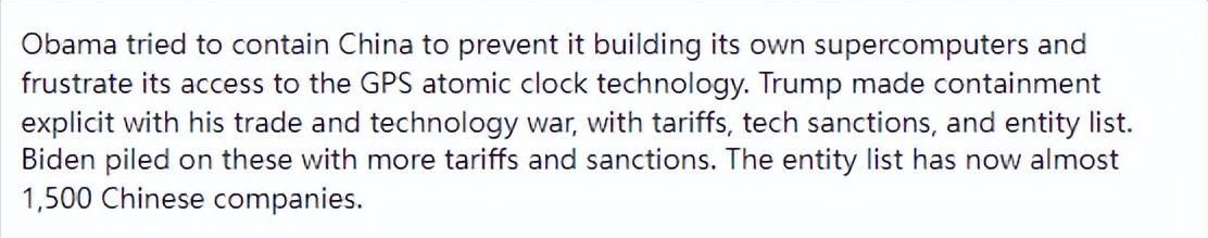 特朗普通过贸易和技术战争、关税、技术制裁和实体清单明确实施了遏制政策,拜登在这些政策上增加了更多的关税和制裁,现在有近1500家中国公司出现在制裁清单上。