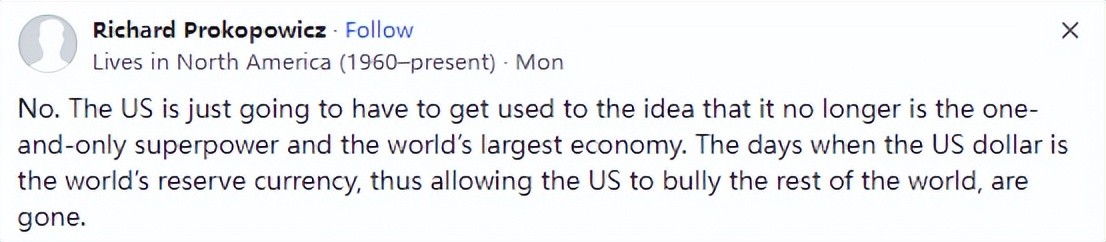因此面对美国网友的提问,不少人也是纷纷在下面评论,来自法国的网友表示,不,美国将不得不适应不再是一个唯一的超级大国和世界最大经济体的想法。