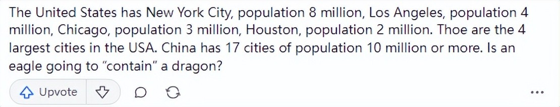 而中国有17个人口超过1000万的城市,正因如此,中国的发展潜力会比美国更大,你认为老鹰会“遏制”龙吗?我认为这会很难。