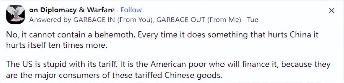 紧接着来自新西兰的网友评论道,不,它无法遏制一个庞然大物,每次它做一些伤害中国的事情,对自己的伤害就会增加十倍,因为美国在很多方面都依赖中国。