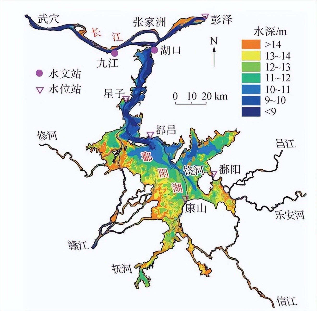 中国面积最大的淡水湖是鄱阳湖。鄱阳湖,位于江西省北部,地处九江、南昌、上饶三市,是中国面积最大的淡水湖,也是中国第二大湖,仅次于青海湖。鄱阳湖以松门山为界,分为南北两部分,北面为入江水道,长40km,宽3~5km;南面为主湖体,长133km,最宽处达74km。鄱阳湖是长江流域的一个过水性、吞吐型、季节性重要湖泊,在平水位(水深14~15m)时湖水面积为3150km²,高水位(20m)时为4125km²,但低水位(12m)时仅526km²。相较于其它淡水湖,鄱阳湖的水域面积变化是最大的。因此有人说,鄱阳湖,高水是湖,低水是河。还有一种说法更加形象,叫做:洪水一片,枯水一线。