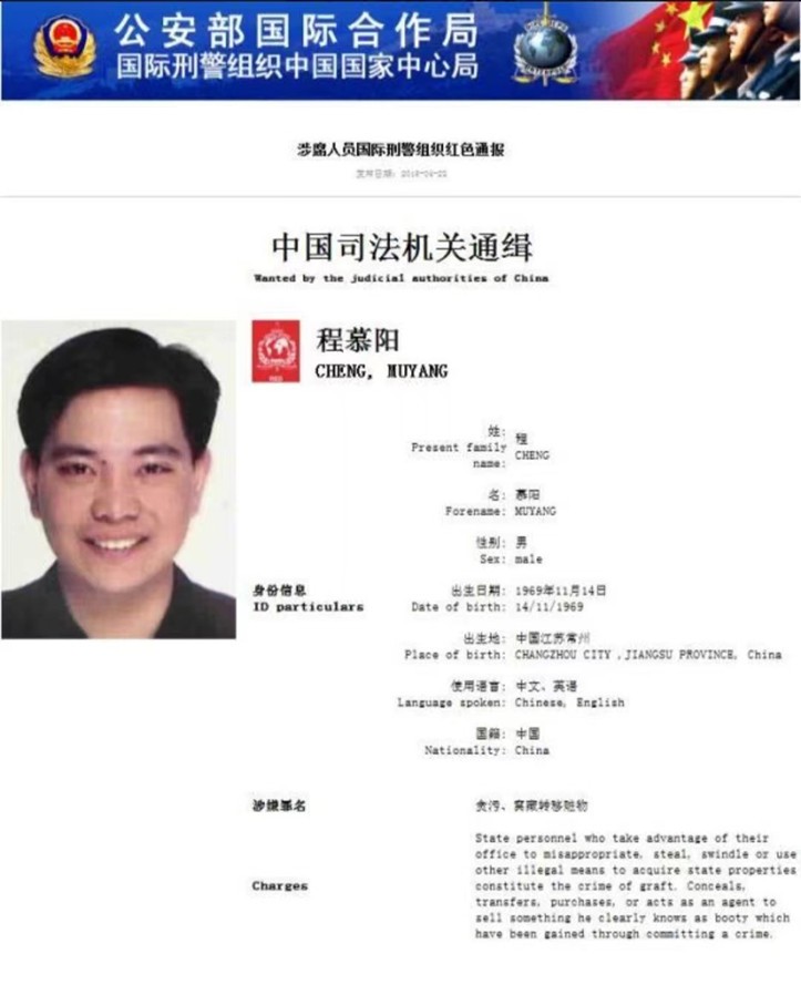 2014年8月27日,国际刑警组织向全世界发布了对程慕阳的红色通缉令。