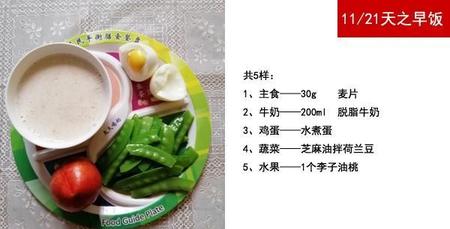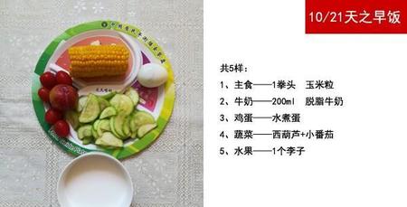 主食—— 1拳头大小;鸡蛋——1个水煮蛋,如果有规律性的运动的话,可以再多吃一个鸡蛋白;牛奶或者无糖豆浆——250ml的牛奶(全脂、低脂和脱脂都可以);蔬菜——1个拳头大小的量。如果您前一天的晚饭吃的比较少,吃完这些早餐还意犹未尽的话,还可以吃一个中等大小的水果。