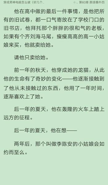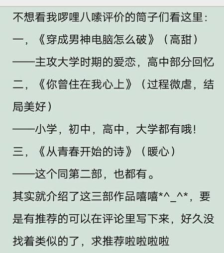 一,《穿成男神电脑怎么破》,看这个题目会觉得无厘头,但其实人家是一本正正经经的小甜文啦~女主是个一心追逐男神步伐的偶尔迷糊的小可爱(不小白哦),“我暗恋的学长——就是颜凛。我高一的时候他高三。我是追着他的脚步,才考上这个学校的。”是不是很励志?必须是啊,大概情节就不赘述了,我就透露一点点小说名啰,其实就是女主有个特殊的小能力,就是以灵魂的方式附身在男主身边的一些物件上,比如电脑啊、手机啊、淋浴头啊,男主家卫生间的把手啦什么的,好吧,是有点小奇葩,但是对于看了这么多文的我来说真是新奇又有爱啊!在后边男主的番外里,其实男主也(很主动哦,只是女主不知道)……高中时期不变的公交车不变的座位,还有毕业时的复习资料,哎呦完全满足我的少女心啰!