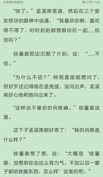 三,《从青春开始的诗》,女主是个很淡定的微胖的姑娘(后面有瘦一点,但是由于男主的积极投喂她就顺其自然了,哈哈),男主是那种可爱的阳光大男孩,后边确定恋爱关系后很忠犬呐,喜欢!貌似这篇推荐字数有点多了哈,我就不啰嗦了,这本真的搞笑又清新,特别好看,强推!