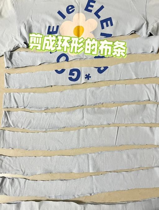 第一步:先把衣服剪成一条一条的,如果是短袖的话,直接就这么剪开就行