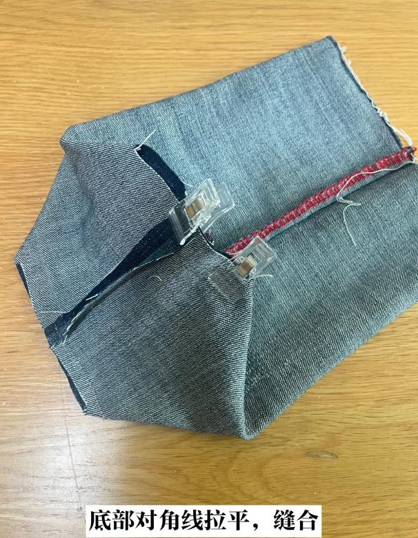 把裤腿下半部分按照底部的对角线拉平、缝合起来就可以了。