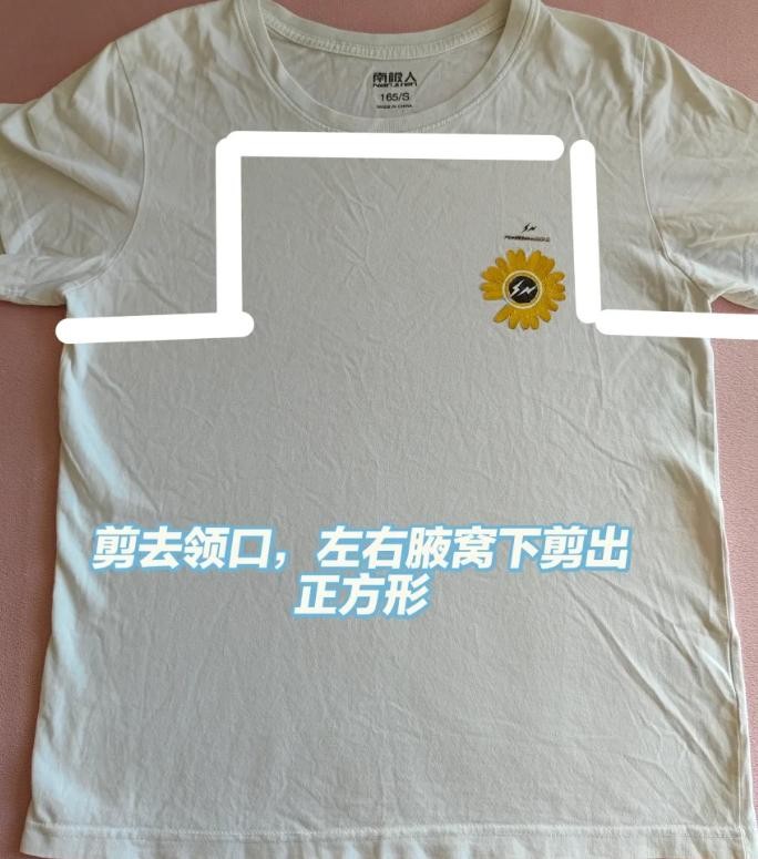 把准备好的短袖,按照图片上的样子剪一下,剪去衣服的领口,左右腋窝下剪出正方形。