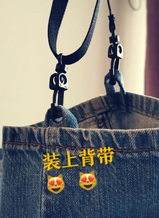 把剪下来的小方块,缝合一下,缝在牛仔裤上面,变成一个背带扣。