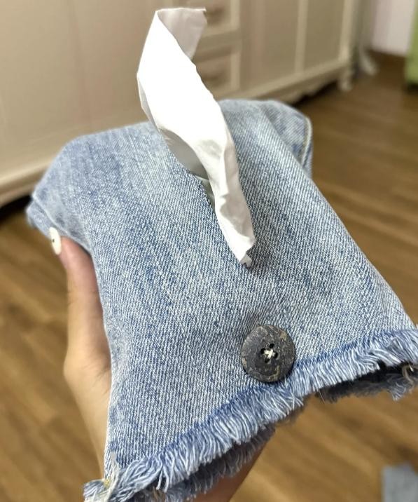 就像我们平时穿的牛仔裤,布料很硬实,扔掉比较浪费,可以用它改造成纸巾盒。