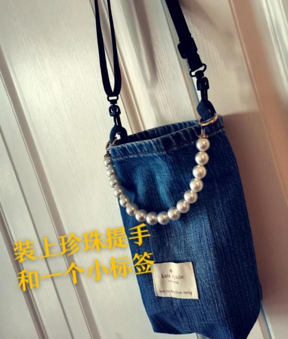 准备一个好看的珍珠链子,缝制在牛仔包上面,粘贴一个小标签。