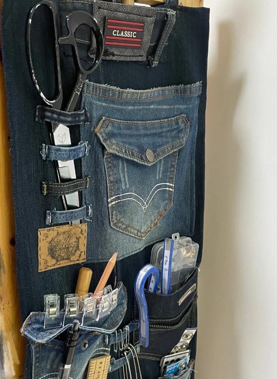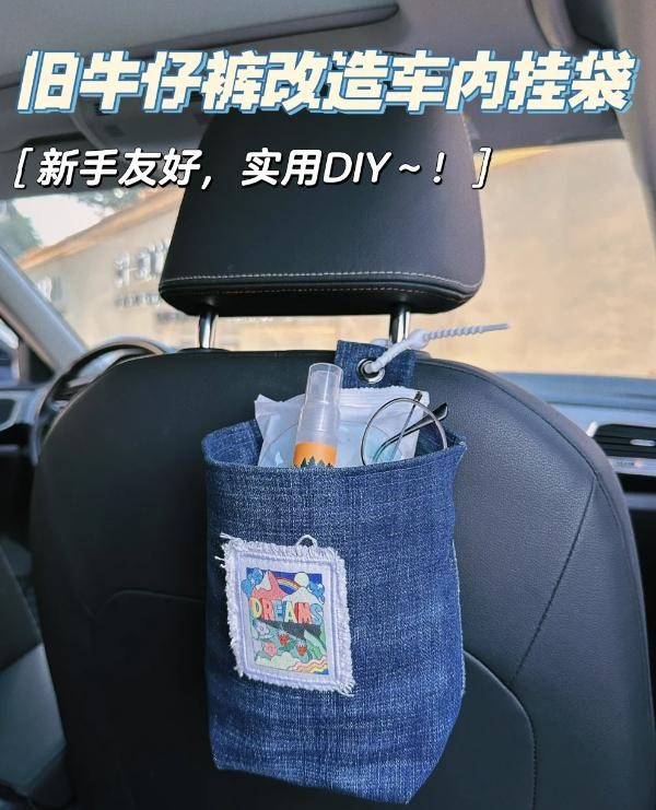 把牛仔袋子缝制好了之后,上面贴上布标,就变成了一个好看的车内收纳袋。