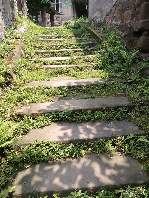毕竟是江边的一个场镇,更何况处于山城,坎坎是不不可少的,这道坎坎或许是鱼嘴镇目前保留得最完整的一道古痕迹,青石板阶梯,衔缝间的野草,看得出这道坎坎的沧桑和年代的久远,石板上行人走过而磨得光滑的石板表面,更能看得出这道坎坎当年对于鱼嘴镇的繁荣和发展有多么的重要,如果说旧的不去新的不来,万一有一天这条坎坎被拆除,感觉这道坎坎的消失将会是鱼嘴镇历史上的一个遗憾。