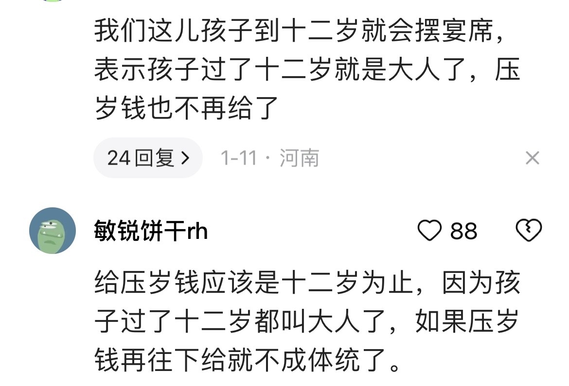 有的地方按老一辈传下来的老规矩,认为12年是生命的一个轮回,13岁算成年,就不用给压岁了。