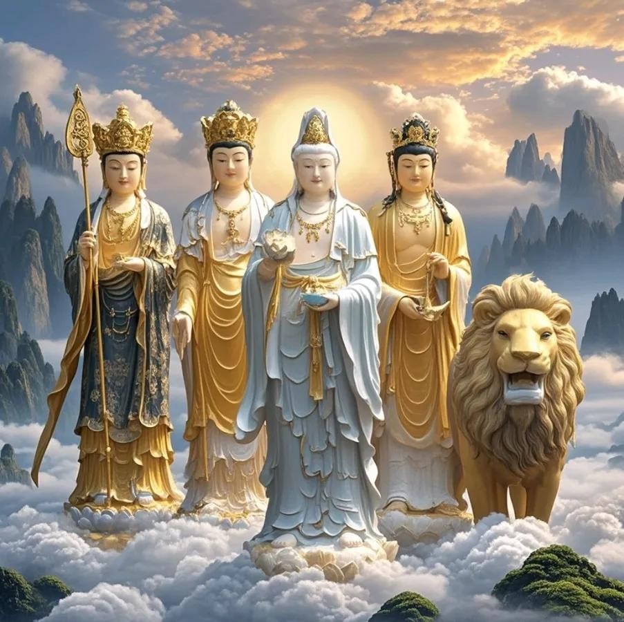 代表着大智慧,常与普贤菩萨一同被供奉在释迦牟尼佛的两侧,合称“华严三圣”。