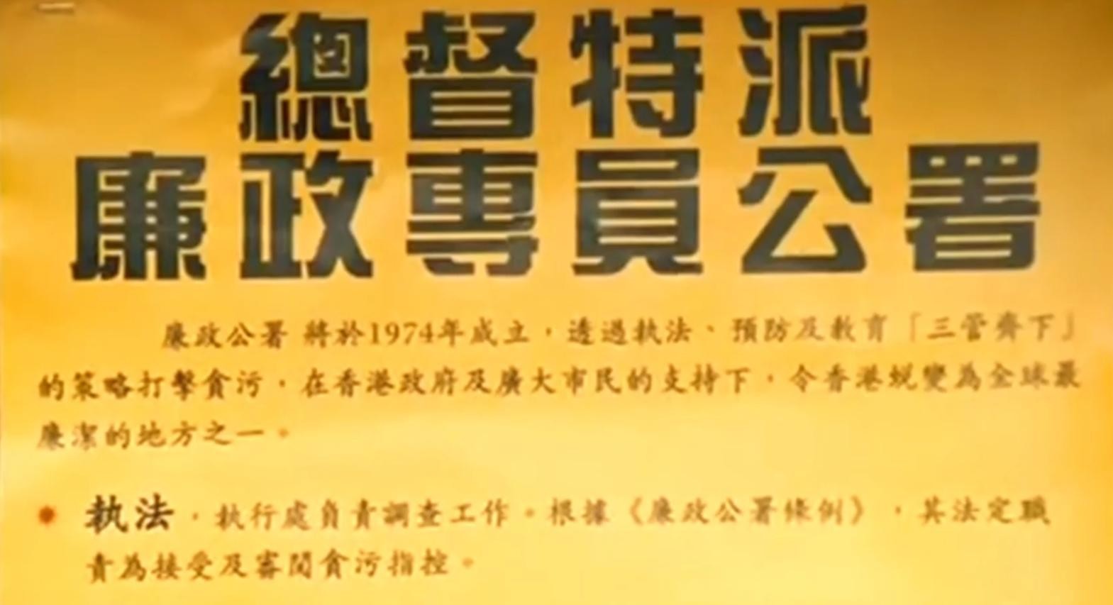 当时的香港还未回归祖国,廉署的全称为“总督特派廉政专员公署”,主要负责督查当时香港警方的贪污受贿行为。