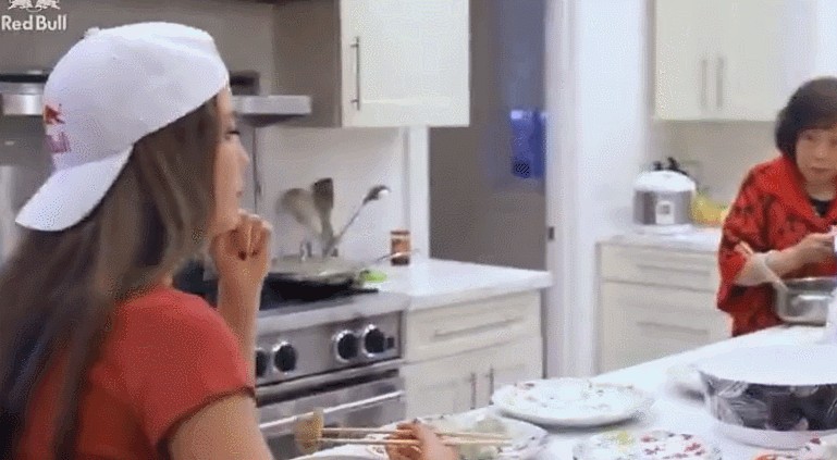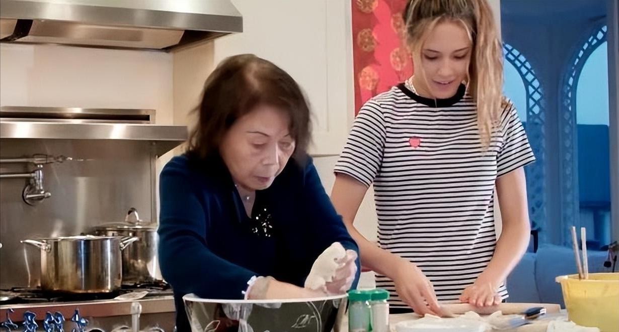 正对面是一张大尺寸的岛台,平时谷爱凌会和奶奶一起在岛台上擀饺子皮、和肉馅、包饺子;
