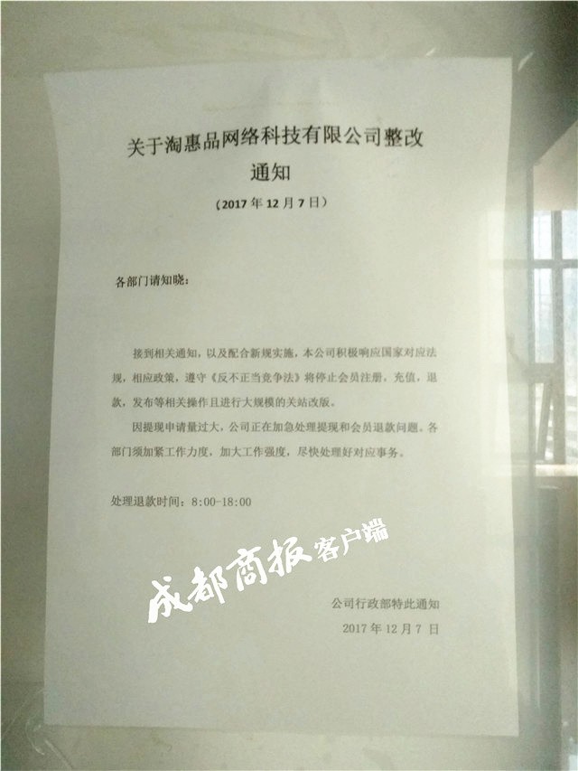 “不是我们不退款,而是我们的8个官方支付宝账户均遭遇了反反复复的恶意投诉,所以账户被反反复复的冻结,由此导致了在线退款无法完成。”对于为何必须到成都的办公地退款,该工作人员解释:“是为了证明身份,不可能随便一个人找到我们,我们都给他打钱。”几名成都本地的商家向记者证实,他们到淘惠品办公地的确领到了退款。