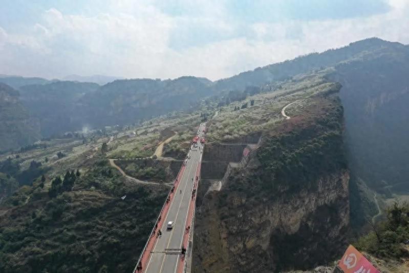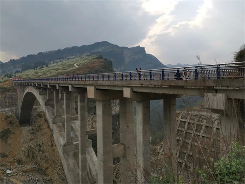 大桥开工建设没多久,我就到“鸡鸣三省”采访。只见隔河相望的两岸悬崖峭壁上都有挖掘机作业,要在悬崖峭壁上各挖出一个深坑,再将桥梁拱座埋进去。听一位随行村干部介绍说,大桥建在两边悬崖上,横跨大峡谷,难度相当大,是世界性难题。据后来的新闻报道介绍,鸡鸣三省大桥仅两岸的开挖量就达到了12万立方米!在当时,是全国第八座悬臂浇筑法建设桥梁,即在桥墩架设操作平台,将主拱圈分为若干节段,采用拱圈悬臂浇筑法的方式,从两边向中间循序渐进浇筑混凝土黏合衔接起来,大桥最大悬臂浇筑节段重量达239 吨,在国内同类型拱桥中浇筑重量居首。