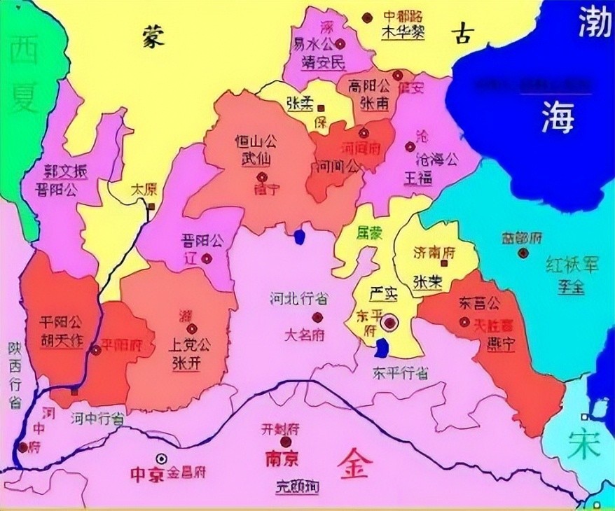 金朝思前想后,知道对于河北、山东等地反正再也不能进行实际意义上的直接统治,便做顺手“人情”,选出九个势力最大的地方武装头目,全部封为“公爵”,这九个人分别是:沧海公王福,河间公移剌众家奴,恒山公武仙,高阳公张甫,易水公靖安民,晋阳公郭文振,平阳公故天作,上党公张开,东营公燕宁。