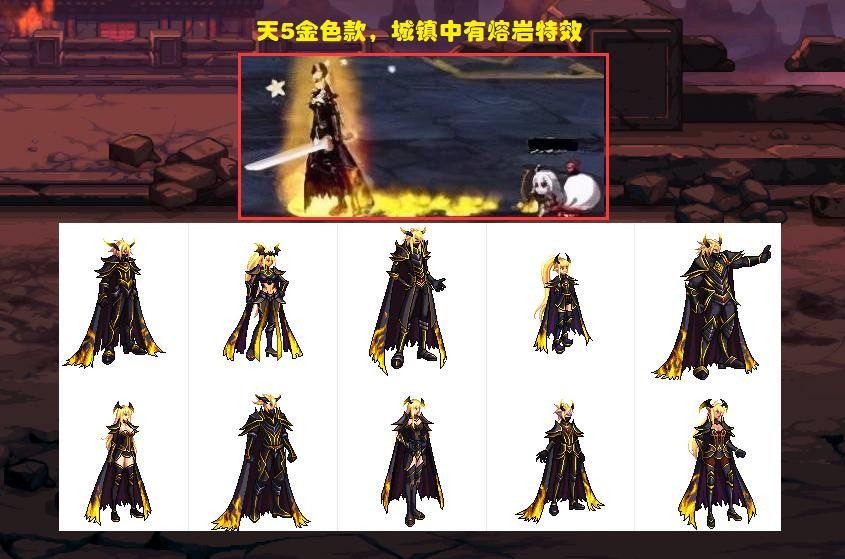 天5除了披风略带风采之外,另外的套装特效也备受青睐,走在城镇中的时候,玩家身后会出现一块块的熔岩效果,金色款的熔岩也是金色的,还算比较吸引暮光了。