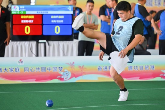 第十二届全国少数民族传统体育运动会(以下简称“运动会”)蹴球比赛在三亚学院风雨球场进行。看似平静的赛场内实则“暗流涌动”。红蓝两色的实心塑料球不断滚动、撞击,选手们目不转睛地观察赛场情况,思考下一轮的对策。