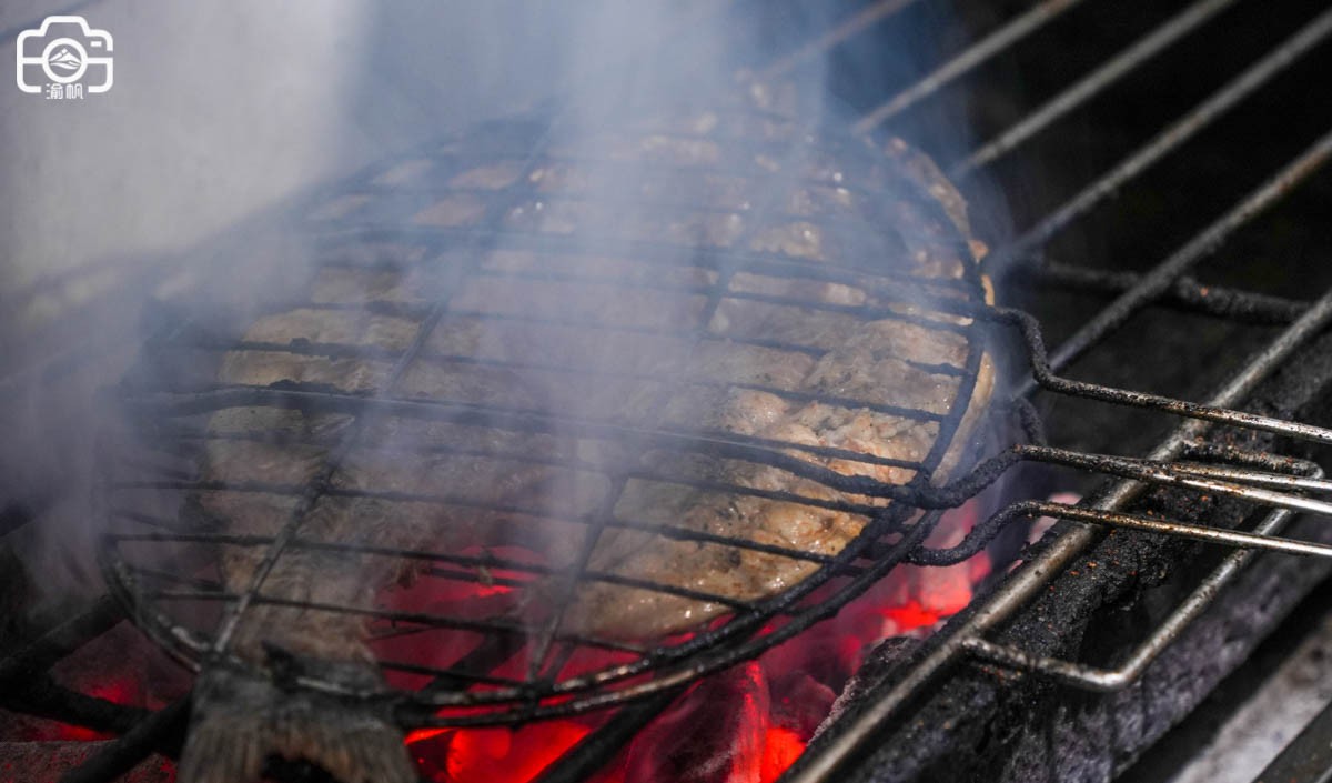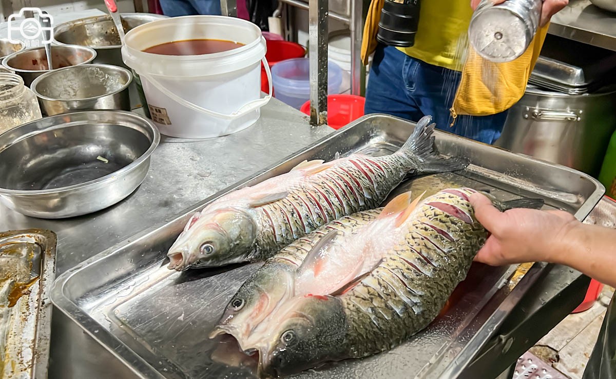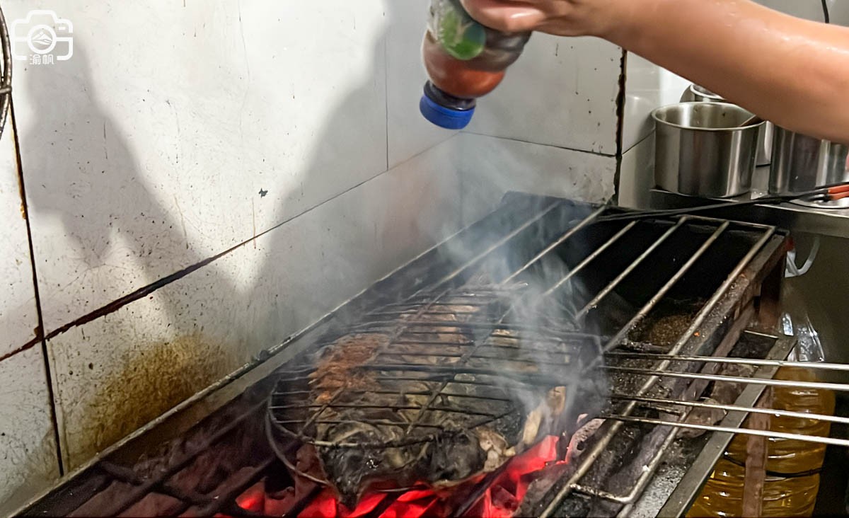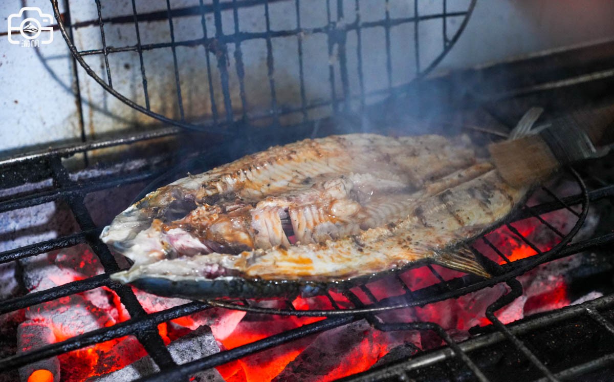 把腌制好的鱼用网状夹具夹住,置于果木炭火上进行烤制,待到5分熟时刷一次烤油,9分熟时加蛋清淀粉并再刷一次烤油,随后略加烘烤即可。