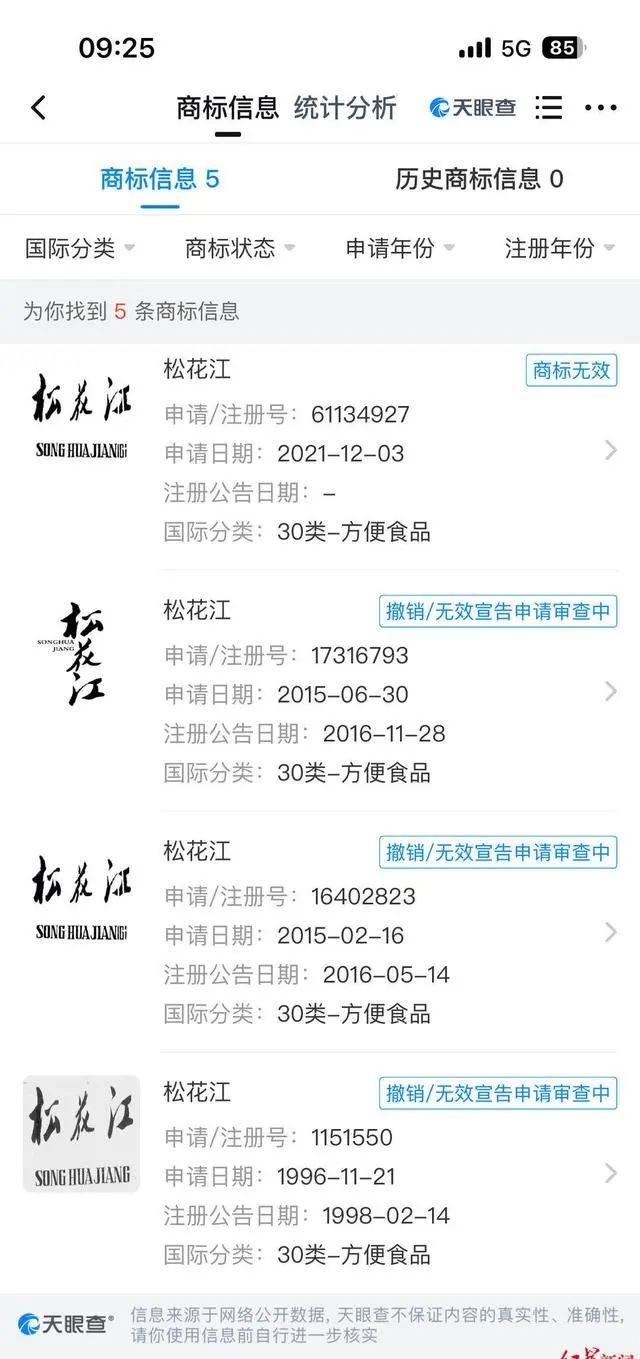 近年来,正大公司的多枚“松花江”商标也持续被他人申请撤销或申请无效宣告。天眼查显示,目前旗下5枚商标,除两枚被认定无效外,其余三枚均在撤销/无效宣告申请审查中。