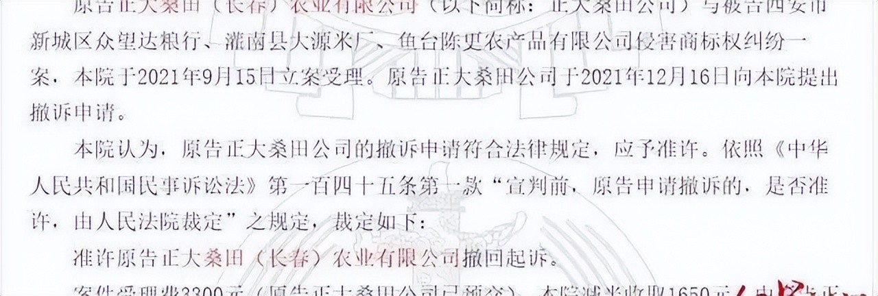 ▲ 2021年正大公司起诉西安市新城区众望达粮行的案件,正大公司撤诉