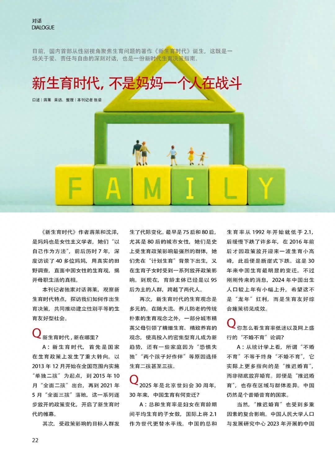 本刊记者独家对话蒋莱,观察新生育时代特点,探访我们如何作出生育决策,共同推动建立性别平等的生育友好型社会。
