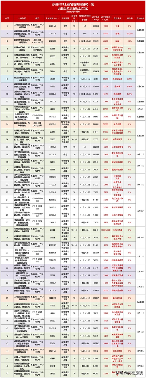 吸金370亿!2024苏州土拍总结!仅47宗供应骤减,低密宅地爆仓!