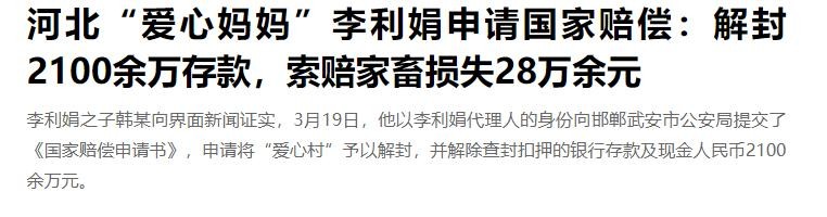 河北“爱心妈妈”李利娟申请国家赔偿:解封2100余万存款,索赔家畜损失28万余元——界面新闻